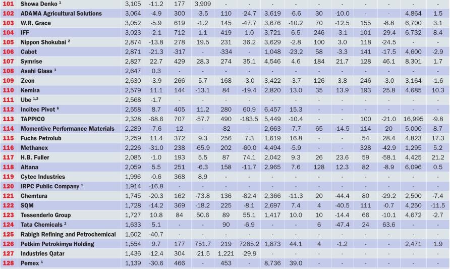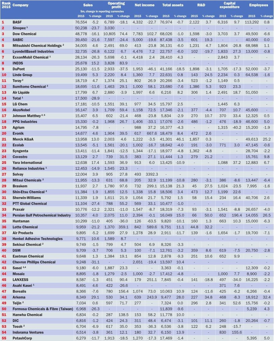 2015年,许多ICIS化工100强企业因原油价格低导致销售显著下降。在报告货币计算,中国石化销售额下降了23.7%,陶氏化学下降了16.1%和沙特基础工业下降了21.6%,而巴斯夫指数下降了5.2%。(涂界)