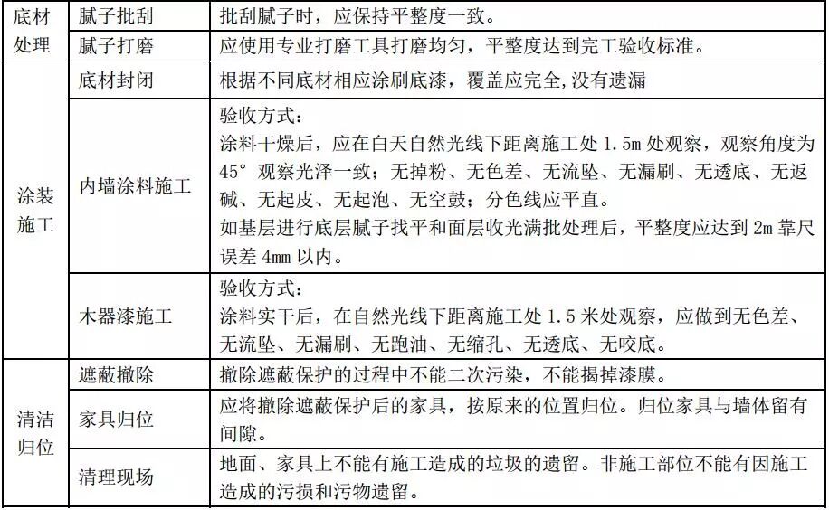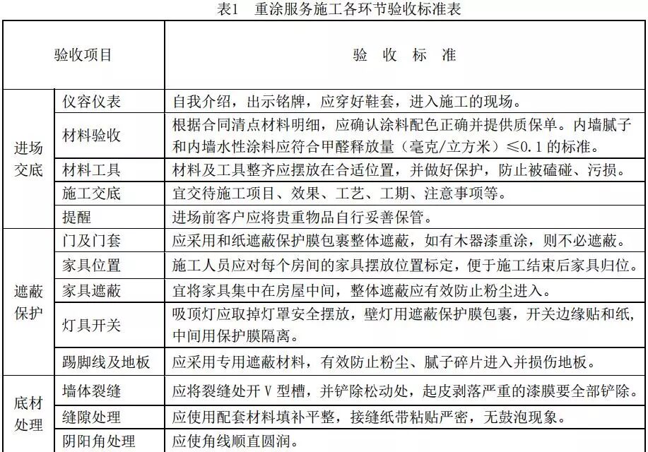重点:应针对施工环节中的每个施工项目做验收,每一步骤按标准确认验收结果,并与客户签字确认,应按《建筑装饰装修工程质量验收规范》GB50210中相关标准执行。验收标准见表1。