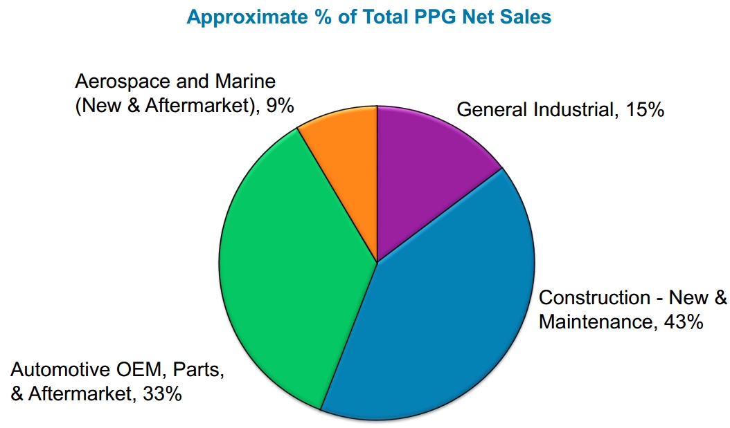 数据显示,PPG工业2016年销售额为147.51亿美元,性能涂料、工业涂料、玻璃三大业务分别占比58%、39%、3%,为85.8亿美元、56.90亿美元、4.81亿美元,其中建筑涂料占比40%,为57.08亿美元。