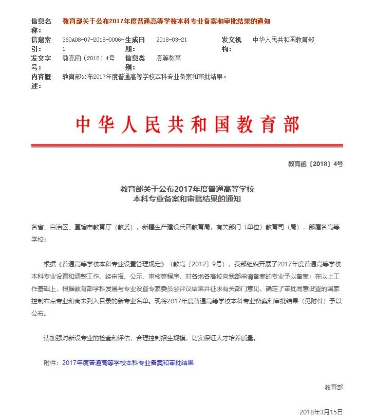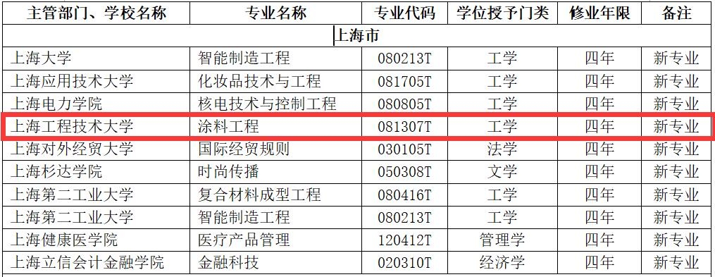 涂界记者3月23日获悉,教育部于2018年3月15日公布了2017年度普通高等学校本科专业备案和审批结果,在新增审批本科专业名单中,上海工程技术大学新设立的“涂料工程”专业在列,专业代码为081307T,学位授予门类为“工学”,修业年限为“4年”。