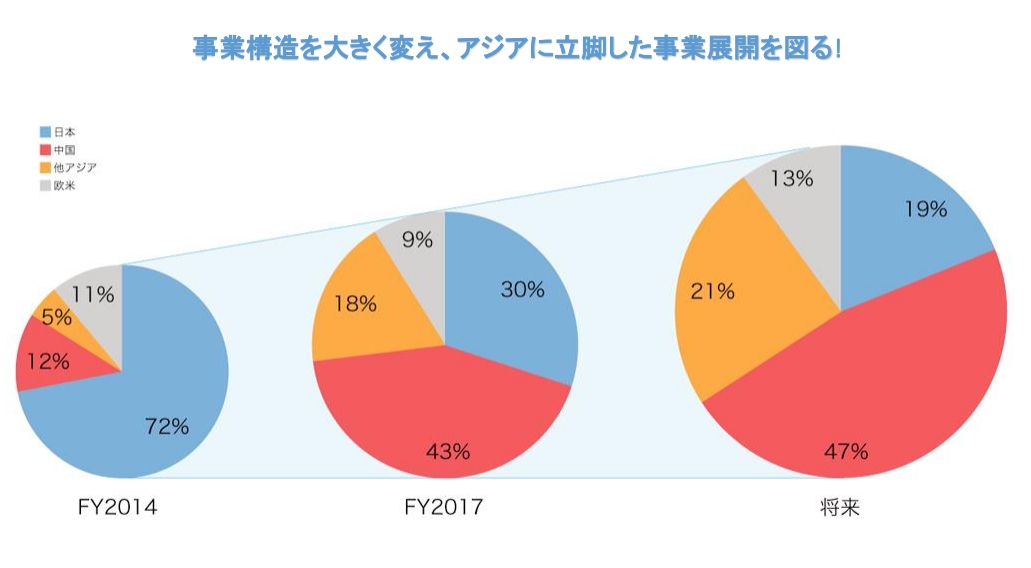 根据日涂控股发布的资料显示,2014财年亚洲市场业务对日涂控股业绩的贡献率为17%,其中中国市场为12%,远远低于日本本土市场的72%。但预计到2017财年,这种格局将发生根本性的改变,亚洲市场业务的贡献率将攀升至61%,其中中国市场达43%,而日本本土市场将萎缩至30%;在更远的将来,这种此消彼长的趋势仍将继续。