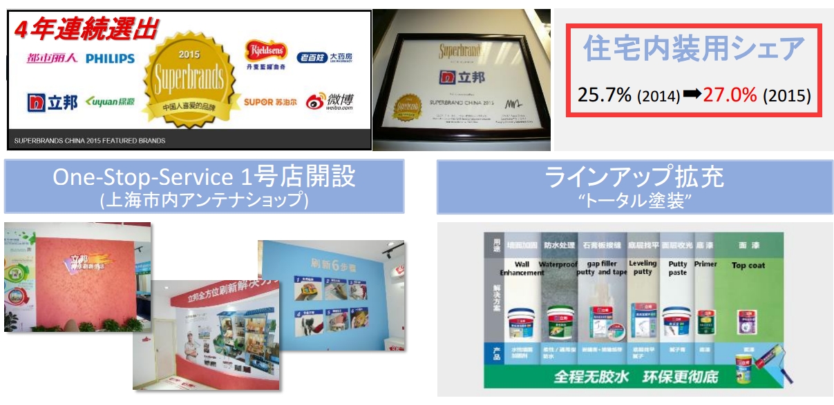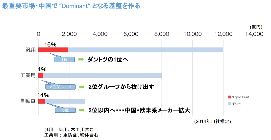 日涂控股称,到2017财年,日涂控股要求在民用涂料、工业涂料、汽车涂料三个产品领域中,分别达到中国市场的“绝对性的第一位”、“在第二集团中处于领先”及“第三位”的目标。