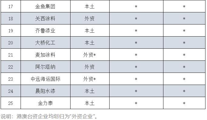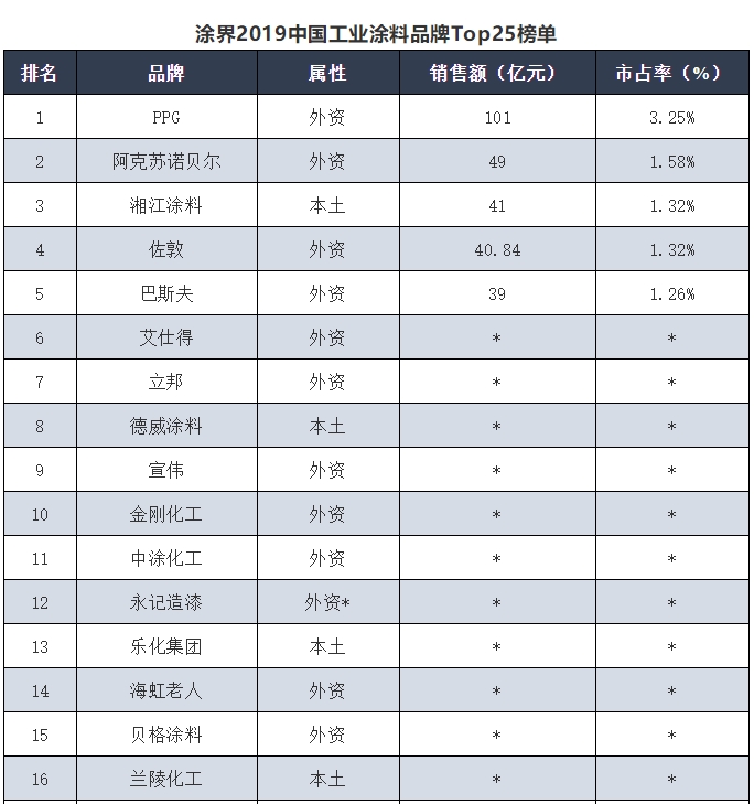 从上榜数量来看,外资企业占据16席,本土企业占据9席;从销售规模来看,外资企业规模较大,而本土企业规模相对较小。不过,国内最大的工业漆企业PPG的市场市占率也仅有3.25%。