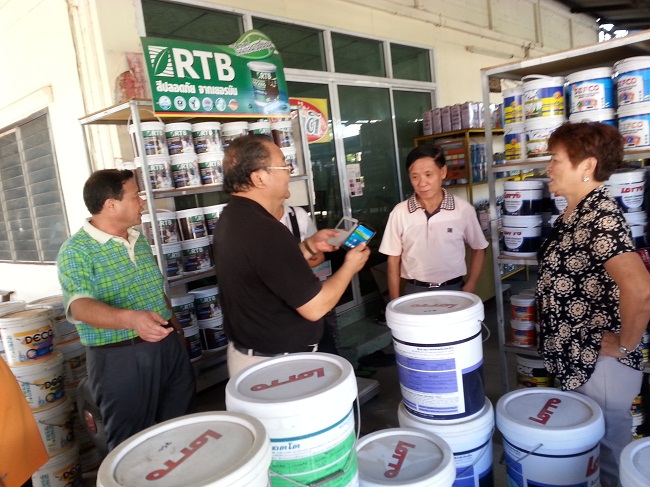 9日上午,考察团一行来到泰国第二大城市清迈,考察了清迈的传统建材涂料市场和建材涂料超市,考察当中还与当地的涂料经销商进行了深入的探讨,据当地经销商介绍,在泰国涂料市场的占有额中泰国的本土品牌TOA是排第一,其次是立邦和佐敦,日本的涂料品牌在泰国占据了外资品牌的绝对优势。泰国人对涂料的品牌认知不是靠广告,主要是靠质量和口碑的积累,高固含的涂料特别受欢迎。在涂料超市里,巴德士方总很认真地和TOA的经销商进行了交流,方总提到TOA的产品线的布局很齐全,也是一家具有历史的涂料企业,其变产品的包装上相对于国内的同类产品的包装更美观而且注重人性化的设计,在产品说明书上还增加了涂料使用过程中的防护措施及公益安全标识,这是值得我们国内企业借鉴学习的地方。