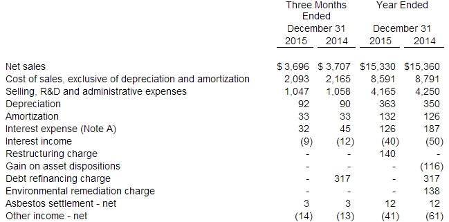 北京时间1月21日晚,PPG工业发布2015年财报显示,全年营业收入为153.30亿美元,基本与去年持平;其中高性能涂料销售额87.65亿美元,工业涂料销售额54.76亿美元,玻璃业务销售额10.80亿美元。剔除玻璃业务后,实际涂料销售额为142.41亿美元。