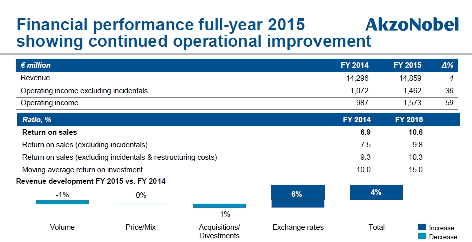 根据阿克苏诺贝尔于2月10日发布的2015年全年业绩报告显示,本年度销售额为148.59亿欧元,其中装饰漆业务领域、高性能涂料业务领域、专业化学品业务领域全年收入分别为40.07亿欧元、59.55亿欧元、49.88亿欧元。剔除专业化学品业务后,实际涂料销售额为99.62亿欧元,约合108.765亿美元。(注:2015年12月31日欧元兑美元汇率:1欧元=1.0918美元)