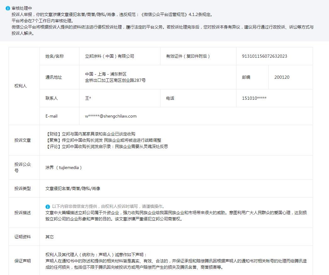 微信通知显示,投诉类型为“文章侵犯名誉/商誉/隐私/肖像”;投诉描述:文章中大篇幅描述立邦公司属于外资企业,强力收购民族企业给我国民族企业和市场带来很大的威胁。意图利用广大人民群众的爱国心理,达到损毁立邦公司的企业形象和声誉的目的。该文章涉嫌严重侵犯立邦公司商誉权。