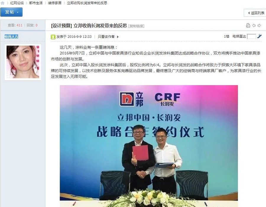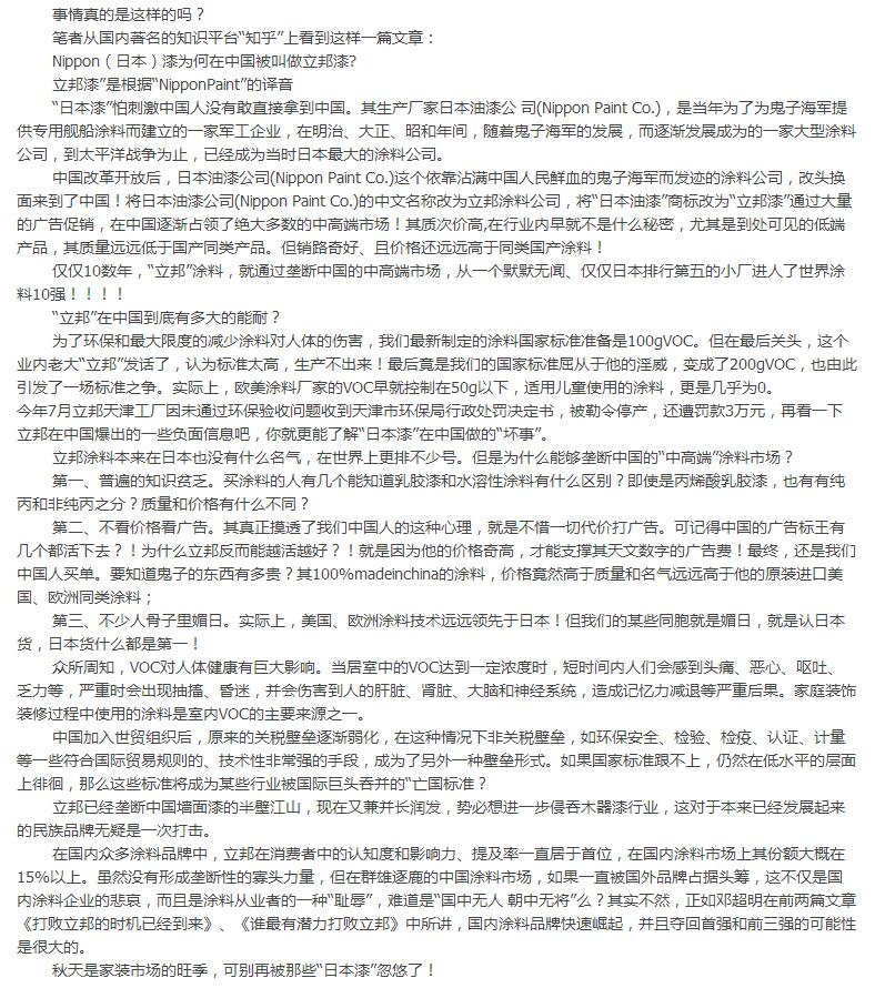 涂界记者在《红网论坛》上发现,一个网名叫“怕死大方”发布了题为“[设计预算]立邦收购长润发带来的反思”的文章,内容提到:Nippon(日本)漆为何在中国被叫做立邦漆?(“立邦漆”是根据“NipponPaint”的译音)“日本漆”怕刺激中国人没有敢直接拿到中国。