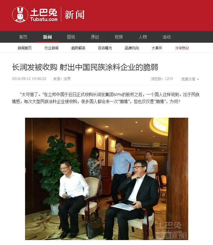 今日,《涂料经》发表题为《立邦公关666……》的独家评论文章,文章说:对于“立邦收购长润发”一事,透过现象看本质,媒体对于民族涂料企业长润发被外资立邦收购,如果单纯从立邦或长润发两家公司的角度,这是一件双赢的商业收购事件。但媒体站在整个中国家具漆产业的角度,表达对民族涂料企业在家具涂料领域“失守”的担忧也无可厚非,因为,立邦欲借长润发补足在家具漆领域的“短板”,这本来就是事实。