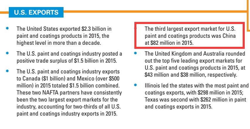 涂界观察员李明月分析认为,虽然多种涂料产品被纳入了加征关税行列,但由于美国对中国的涂料出口额占比较小,加征关税后并不会产生多大的影响。根据美国涂料工业协会公布的数据显示,2015年美国对中国的涂料产品出口额仅为8200万美元(注:第一大出口国是加拿大,约10亿美元;第二大出口国是墨西哥,约5亿美元)。