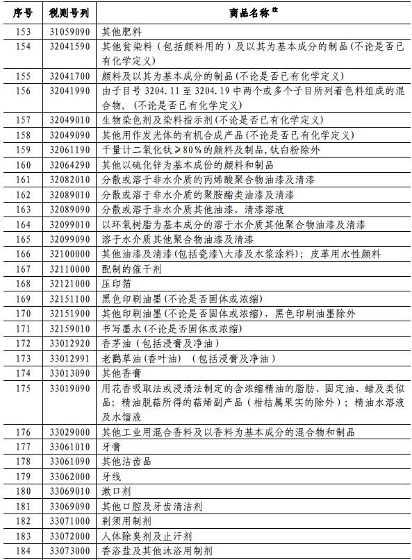 在“对美加征10%关税商品清单”中,硅藻土、钛白粉;二氧化钛为基料的颜料及制品,干量计二氧化钛<80%;铬化合物为基本成分的颜料及制品,分散或溶于水介质的丙烯酸聚合物或乙烯聚合物油漆及清漆;制漆用颜料(分散于非水介质中呈液状或浆状的)及零售形状或零售包装的染料、色料;其他安装玻璃用油灰、接缝用油灰、树脂胶泥、嵌缝胶及其他类似胶粘剂,漆工用填料;其他有机表面活性剂等974种商品在列。