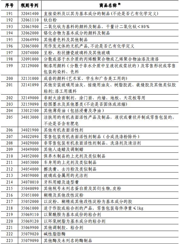 在“对美加征20%关税商品清单”中,颜料及以其为基本成分的制品(不论是否已有化学定义);干量计二氧化钛≥80%的颜料及制品,钛白粉除外;其他以硫化锌为基本成份的颜料和制品,分散或溶于非水介质的丙烯酸聚合物油漆及清漆,分散或溶于非水介质的聚胺酯类油漆及清漆,分散或溶于非水介质其他油漆、清漆溶液,以环氧树脂为基本成分的溶于水介质其他聚合物油漆及清漆,溶于水介质其他聚合物油漆及清漆,其他油漆及清漆(包括瓷漆\大漆及水浆涂料),皮革用水性颜料,初级形状的不饱和聚酯,初级形状的酚醛树脂,初级形状的聚亚氨酯等1078种商品在列。