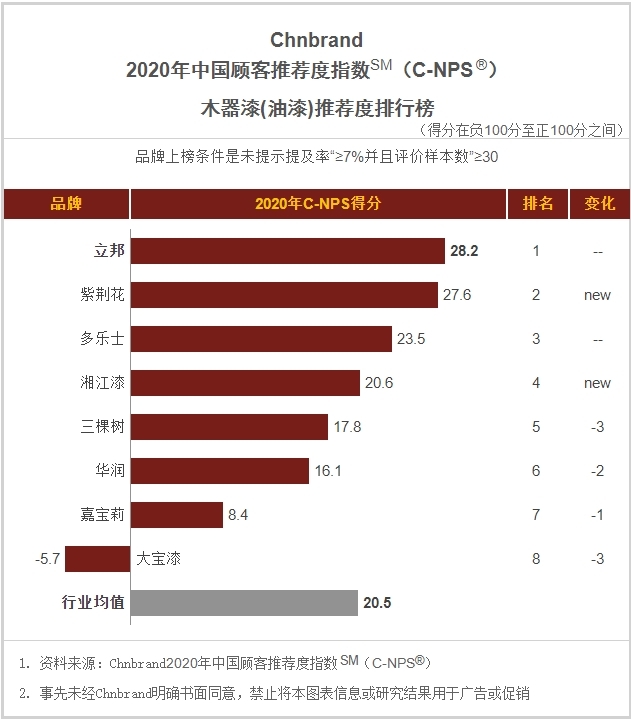 2020年中国顾客推荐度指数(C-NPS®)木器漆(油漆)推荐度排行榜显示,立邦以28.2分排名第一位,紫荆花、多乐士分别以27.6分、23.5分位居第二、三位,湘江漆、三棵树、华润、嘉宝莉、大宝漆则分别以20.6分、17.8分、16.1分、8.4分、-5.7分位居第4-8位。行业均值为20.5分。
