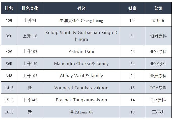来自泰国TOA涂料的沃纳拉特·唐卡拉瓦昆(Vonnarat Tangkaravakoon)以15亿美元身价排名第1415位,今年为首次上榜。来自泰国TOA涂料的普拉查克·唐卡拉瓦昆(Prachak Tangkaravakoon)以14亿美元身价排名第1513位,财富较往年下降6亿美元,排名较往年下降345位。